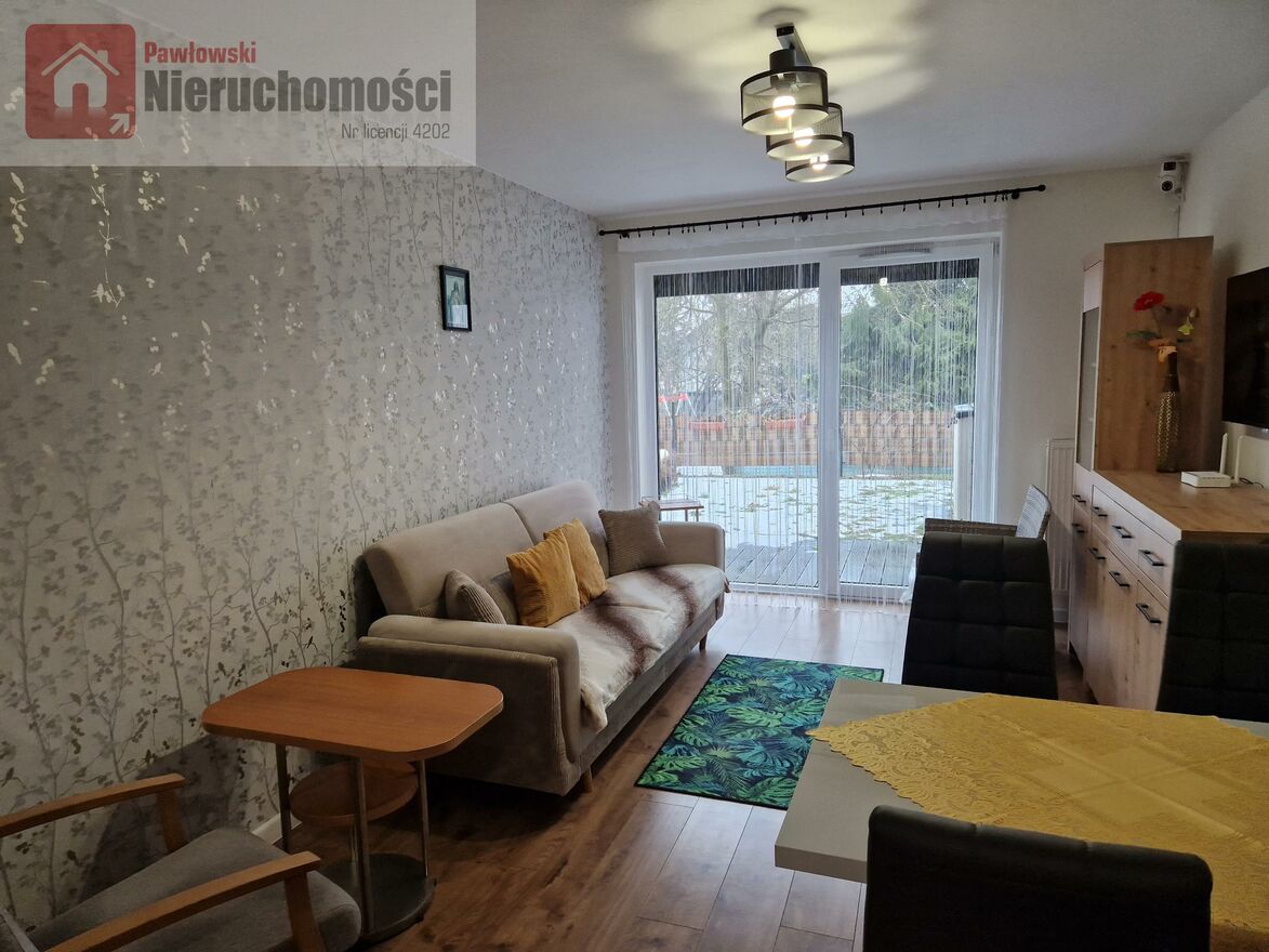Lokal składa się z 1 sypialni, salonu połączonego z aneksem kuchennym i wyjściem do ogrodu, łazienki z WC i przedpokoju. Kuchnia jest w pełni umeblowana w meble , stół, krzesła, sprzęty AGD. W salonie znajduje się sofa i telewizor. W łazience znajduje się pralka a w sypialni łóżko. W sypialni jest klimatyzacja. Mieszkanie jest wolne od zaraz. Opłaty wynoszą około 660 zł/msc + prąd. Najem w trybie najmu okazjonalnego. brak możliwości trzymania zwierząt. Polecamy !